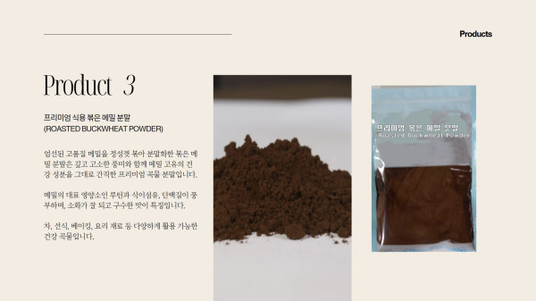 | 프리미엄 볶은 메밀분말 | 최상급 | 1톤 | 6,560 |